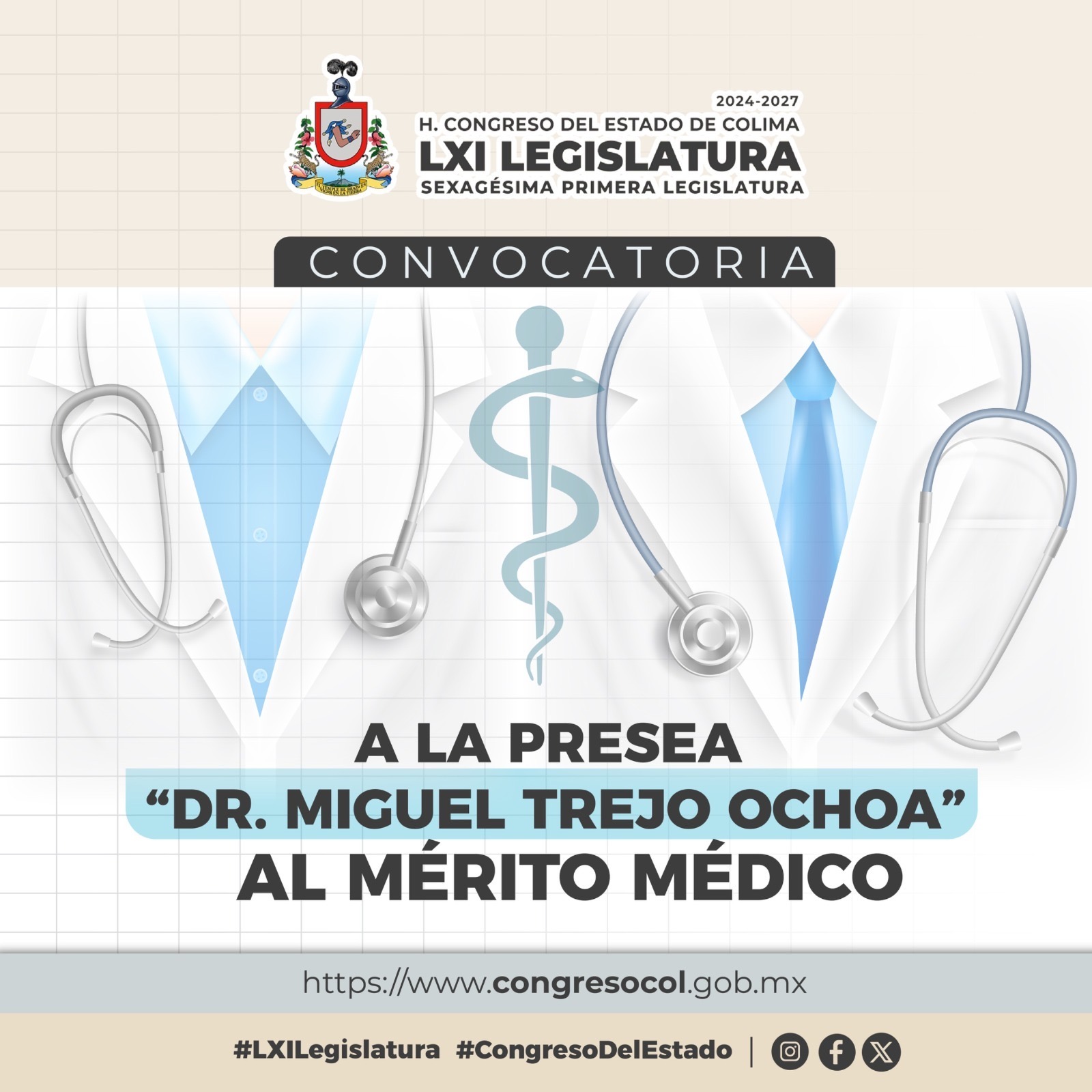 El H. Congreso del Estado de Colima, reitera la invitación a las y los profesionales de la salud, a participar en la convocatoria 2025 de la Presea “Dr. Miguel Trejo Ochoa”, que se entrega a las personas con destacada trayectoria y aportaciones en el ámbito médico en Colima.Dicha convocatoria tiene como fecha límite el próximo 13 de octubre de 2025.