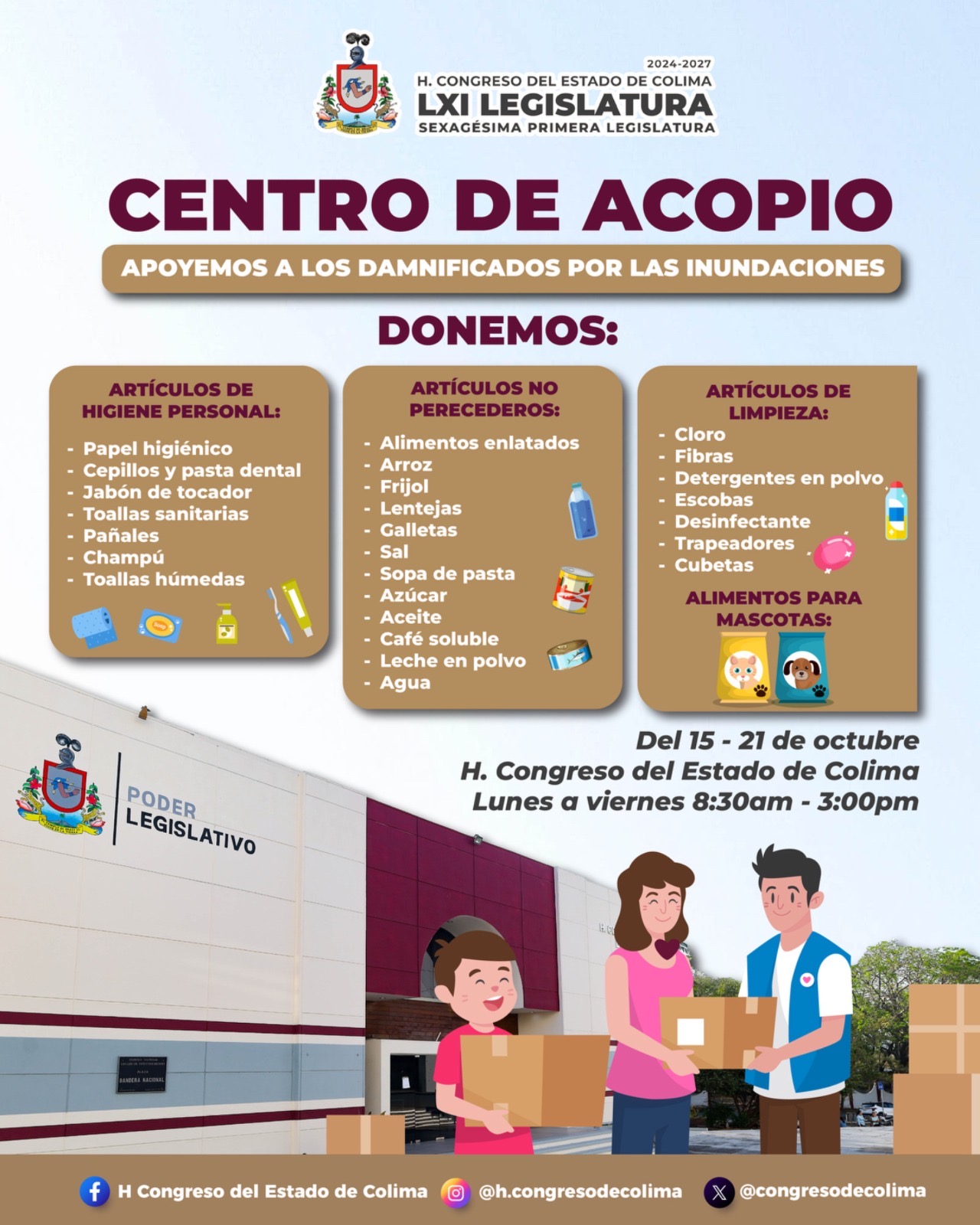 El H. Congreso del Estado de Colima, instaló un centro de acopio para reunir víveres y artículos de primera necesidad, que serán enviados a las familias afectas por las recientes inundaciones en varios estados del país.