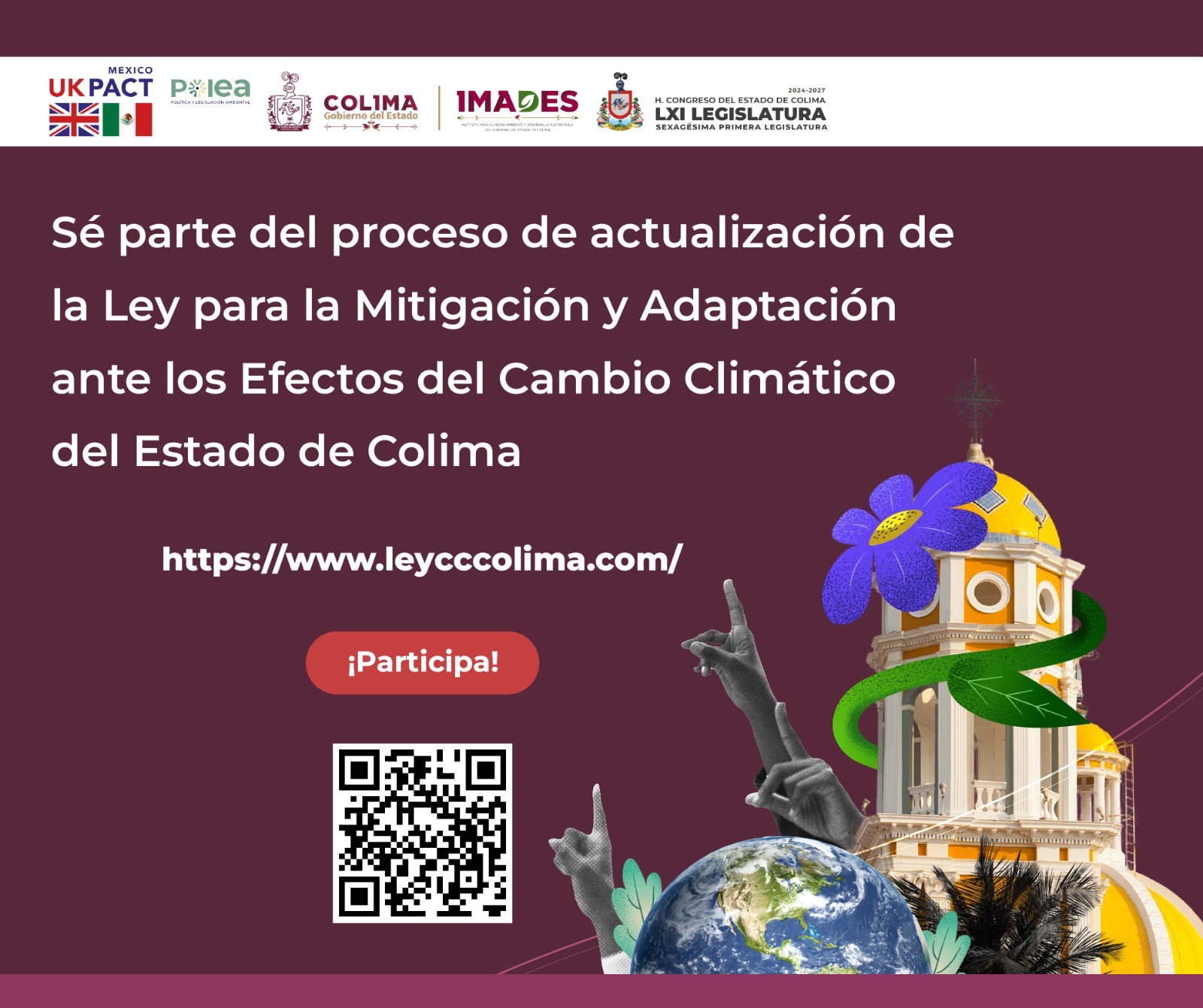 El Honorable Congreso del Estado de Colima, en coordinación con el Gobierno del Estado de Colima a través del Instituto para el Medio Ambiente y Desarrollo Sostenible del Estado de Colima (IMADES), invita a las y los colimenses a participar en la encuesta que se realiza como parte del proceso de actualización de la Ley para la Mitigación y Adaptación ante los Efectos del Cambio Climático del Estado de Colima.