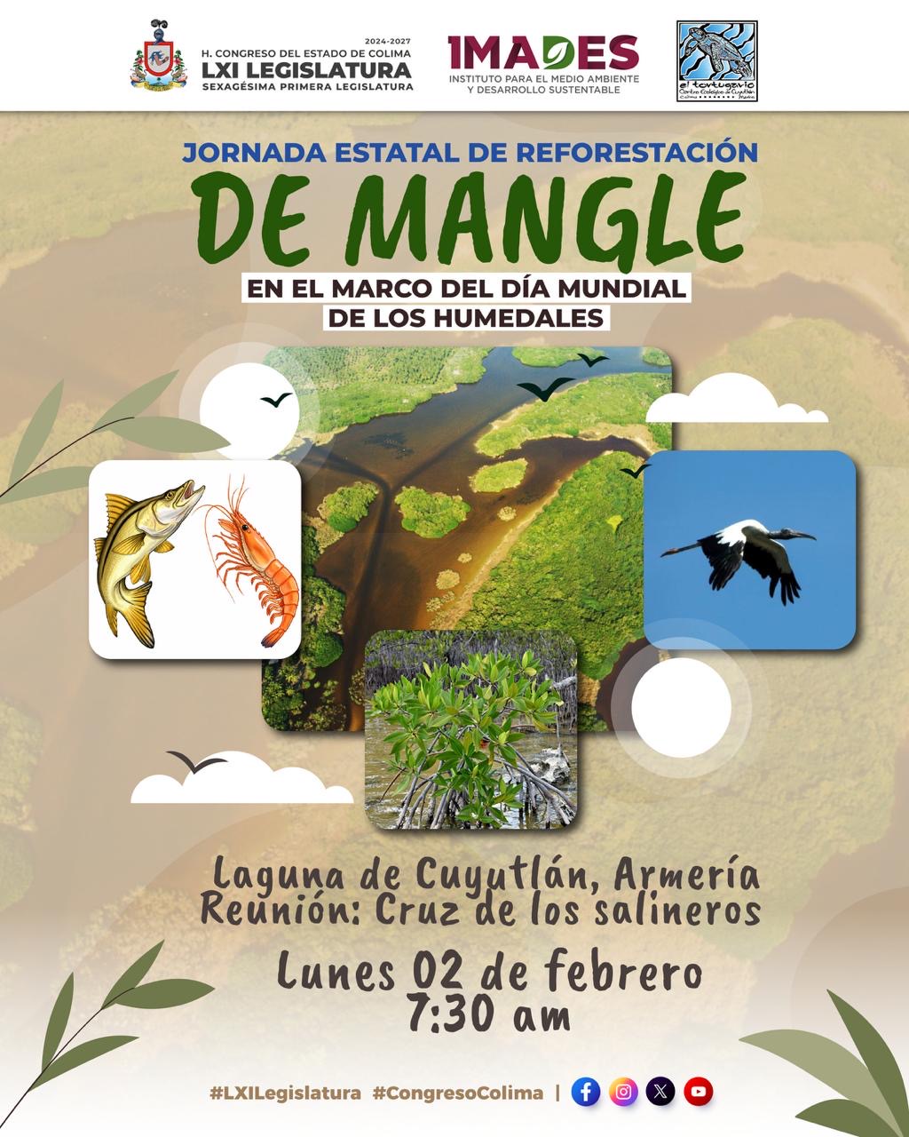 El H. Congreso del Estado de Colima, en coordinación con el Instituto para el Medio Ambiente y Desarrollo Sustentable (IMADES) y el Centro Ecológico de Cuyutlán “El Tortugario”, llevarán a cabo el próximo lunes 02 de febrero, una Jornada Estatal de Reforestación de Manglar, en el marco del Día Mundial de los Humedales.