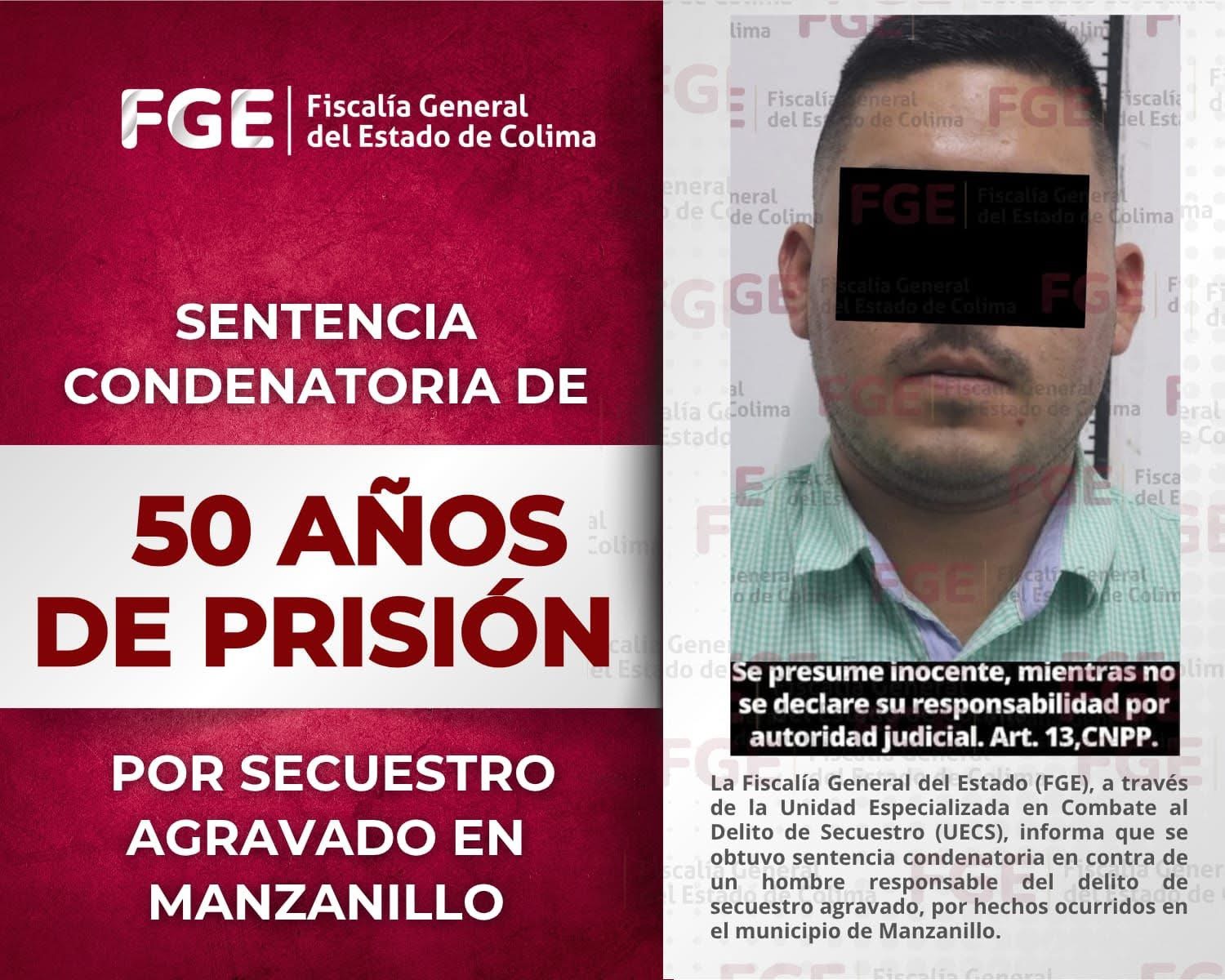 La Fiscalía General del Estado (FGE), a través de la Unidad Especializada en Combate al Delito de Secuestro (UECS), informa que se obtuvo sentencia condenatoria en contra de un hombre responsable del delito de secuestro agravado, por hechos ocurridos en el municipio de Manzanillo.